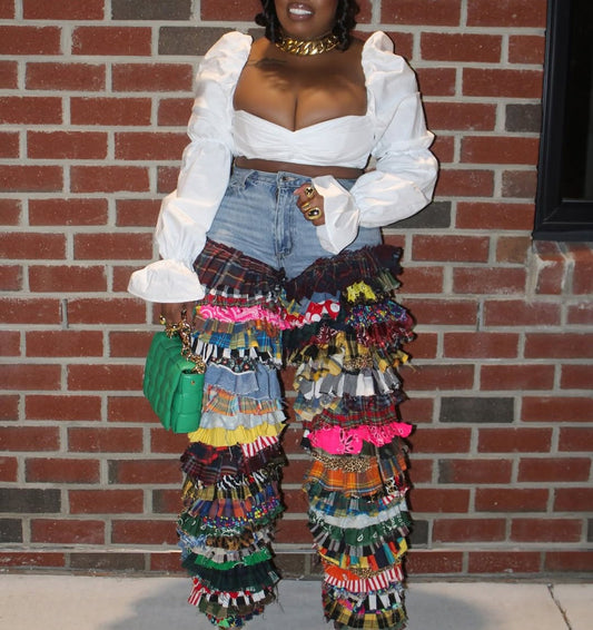 Ruffled Patchwork High Waist Jeans