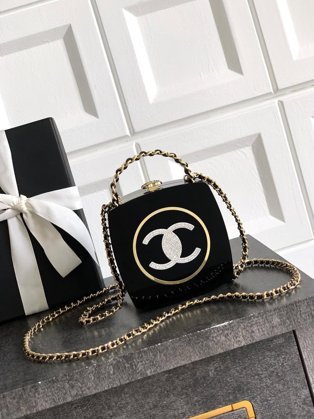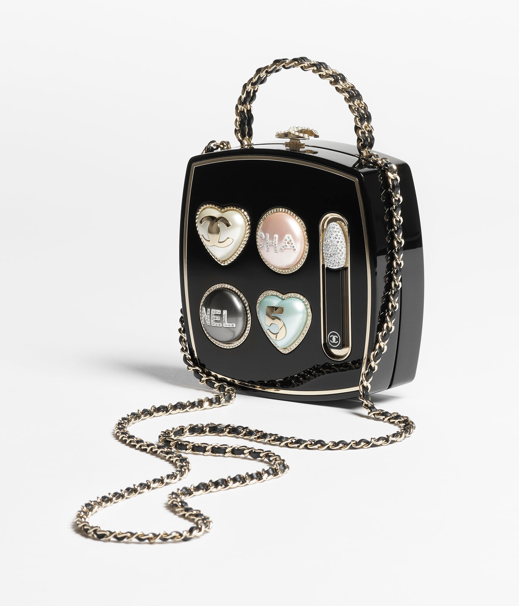This rare, collectible handbag features a unique design, inspired by a makeup case and cleverly transformed into a jewel-like evening bag. Crafted from glossy black resin with gold-tone details, it is adorned with a gem-encrusted heart motif, a crystal CC logo turn-lock closure, and the brand's signature black leather woven chain handle. The detachable chain strap allows it to be worn as a clutch or a crossbody bag, making it a captivating accessory for upscale dinners and red carpet events.