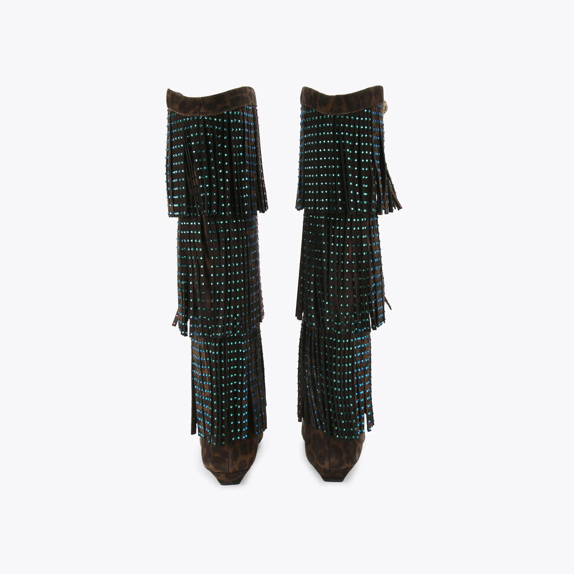This Western Fringe Pull On boot is crafted from a leopard printed suede with statement crystal embellished fringe across the ankle shaft.